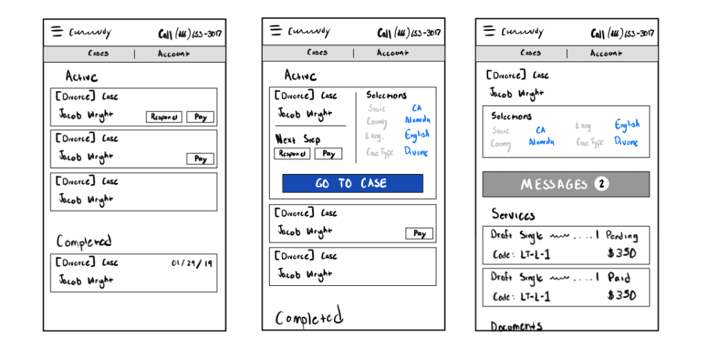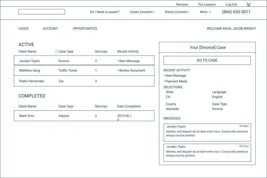 Making dashboards for each type of user. There were two users I created dashboards for: one for attorneys and one for clients. I used the personas to guide my decision-making and help an attorney have more control and organization of each case. For the clients, their focus was case updates.